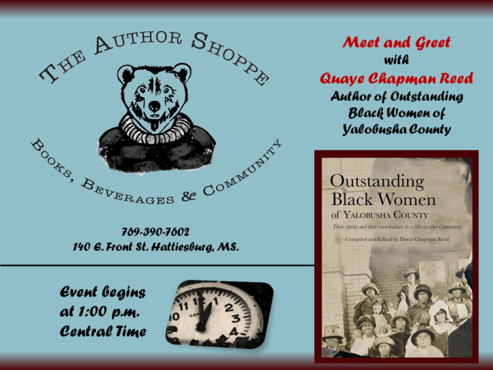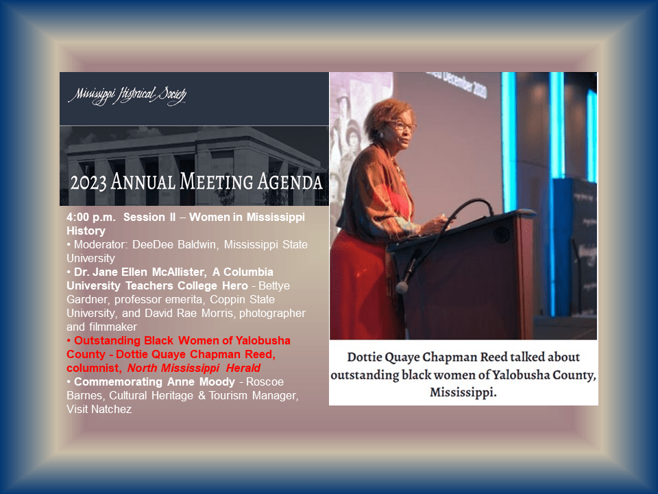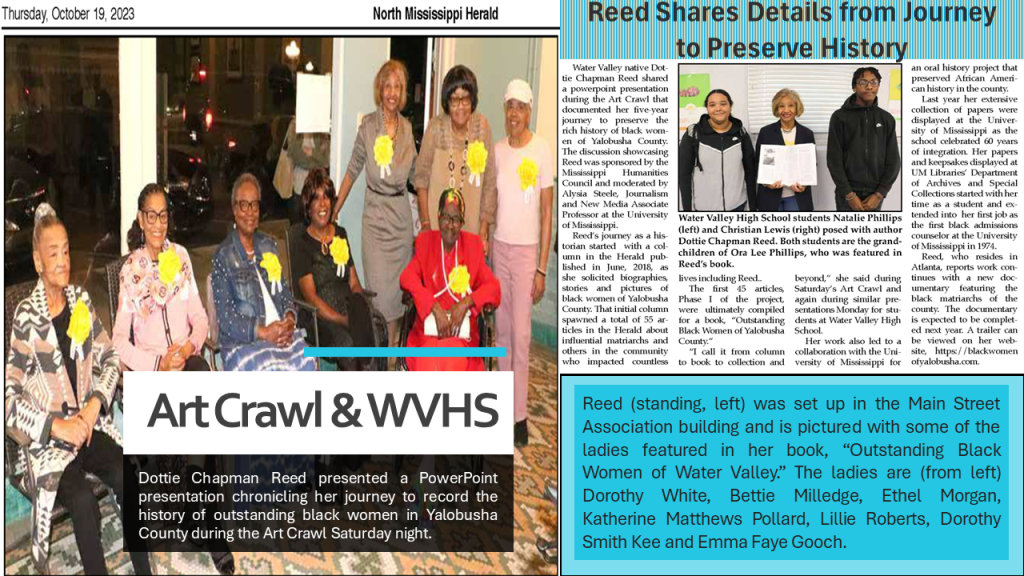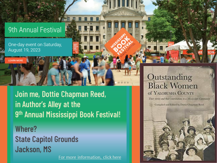 Join author and researcher “Dottie” Quaye Chapman Reed at the Switzer Library for a discussion about the amazing Black Women of Yalobusha County, 4.22.2024. Register Here