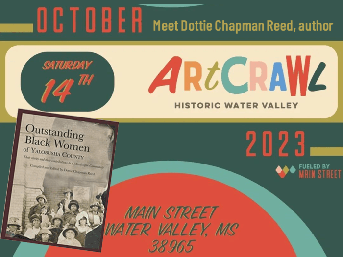 207 N Main Street (Main Street Association Office) will host Dottie Quaye Chapman Reed, Alysia Steele, and a panel of women featured in Dottie’s book – Outstanding Black Women of Yalobusha County. A trailer for a documentary filmed by The Valley Imagery & Productions will be shown. This speaking engagement was made possible by Mississippi Humanities Council. (For more information)