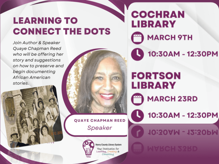 Quaye Chapman Reed presented at the Henry County Cochran and Fortson Libraries, 3.9.2024 & 3.23.2024
